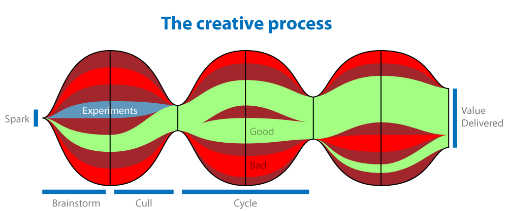 A related idea is a diagram from an old Dan C post about the creative process. It’s a process of expansion and contraction—he refers to them as brainstorming and culling. With every expansion you remove some constraints, broaden boundaries, explore new paths. With every contraction you keep the new good bits you discovered, and rediscover the now larger gem of goodness within what you’re building.