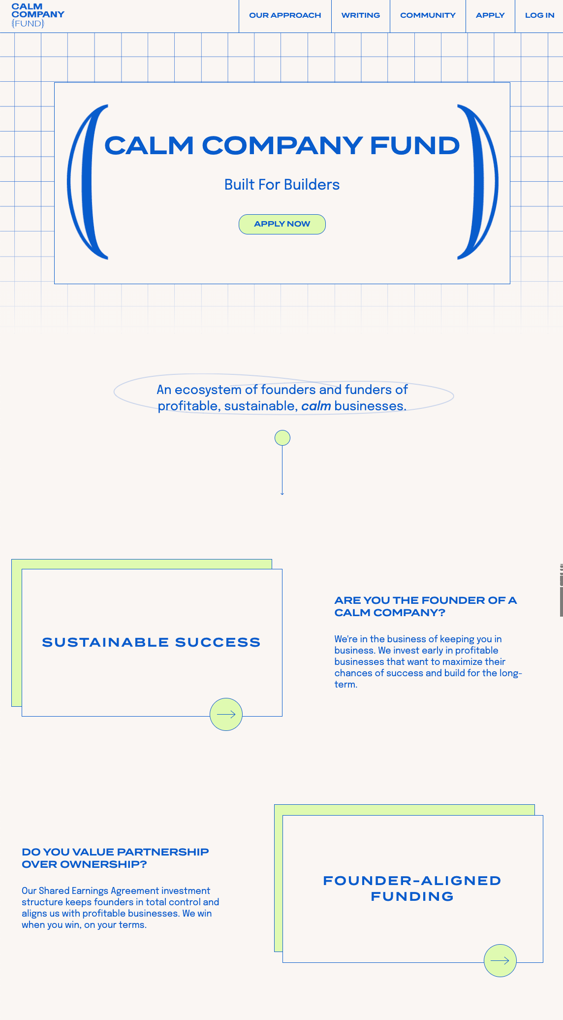 The last example I'll give is Calm Company Fund. "Built for Builders" is their tagline, and the unrounded rects give the site a blueprint-y functional feel. Similar to Berkeley Graphics this conveys a "we're for professionals" vibe. I don't have much to add, I just like how this site looks